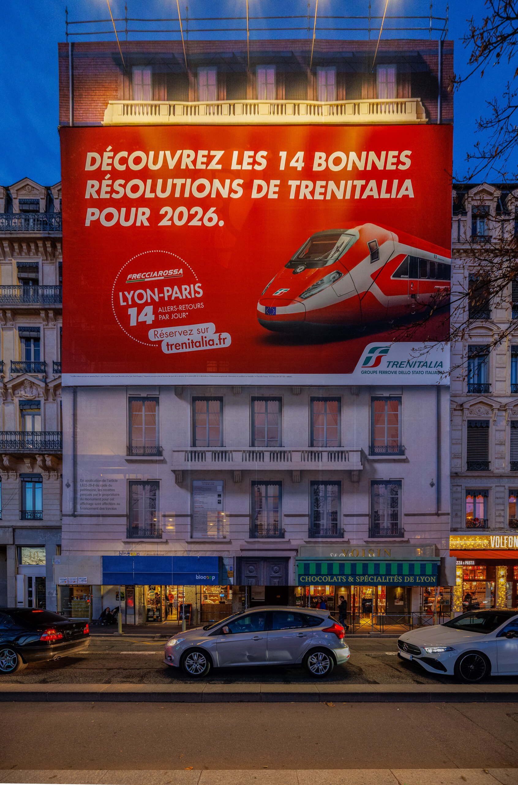 À Bellecour, les mobilités se croisent, les regards aussi. Ici, on ne fait pas que passer : on repasse, tous les jours. Pour un acteur du transport, s’afficher sur un bâtiment en rénovation, au 11 ou au 27 rue Bellecour, c’est inscrire son message au cœur des usages, là où la mobilité se vit réellement. Trenitalia l’a prouvé avec trois campagnes sur ces deux emplacements d’exception en un an.