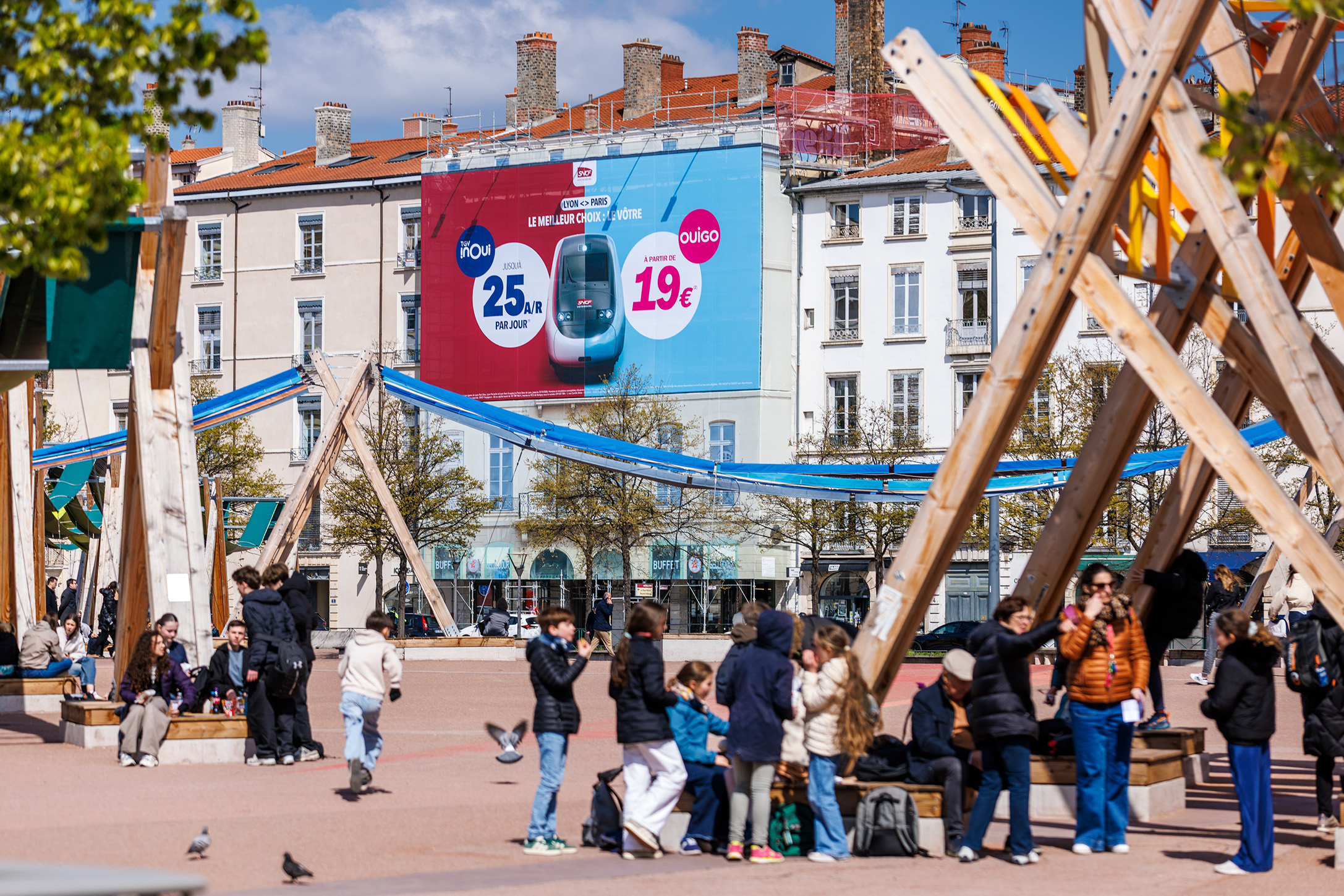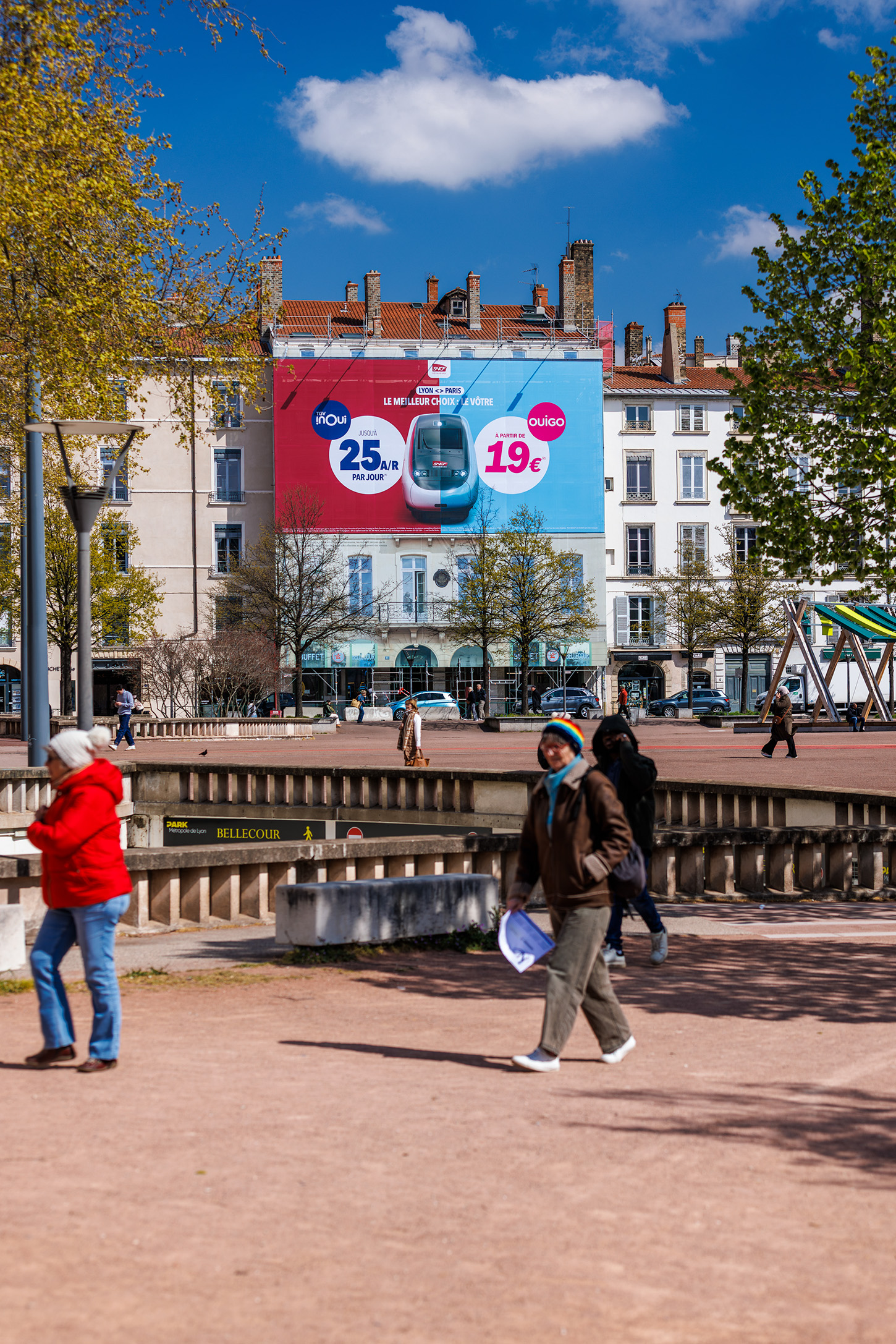 En ce mois d’avril, la SNCF choisit la plus belle place lyonnaise pour promouvoir la mobilité. L’entreprise met en avant deux façons de voyager vers la capitale. D’un côté, le confort de TGV Inouï attire les habitués. De l’autre, les tarifs d’OUIGO séduisent les voyageurs spontanés. Finalement, cette complémentarité réunit toutes les envies. Déjà présente sur un site remarquable similaire en 2022, la marque renouvelle sa présence sur la Presqu’île. Elle y affiche une ambition exceptionnelle avec une toile à la hauteur.