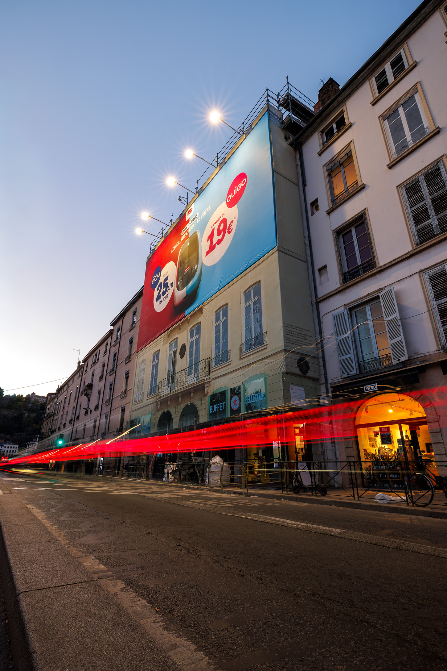 Parfaitement tendu, notre affichage XXL en toile microperforée à Lyon couvre 180 m² de surface. Les couleurs de TGV Inouï et d’OUIGO dialoguent harmonieusement sur la façade.