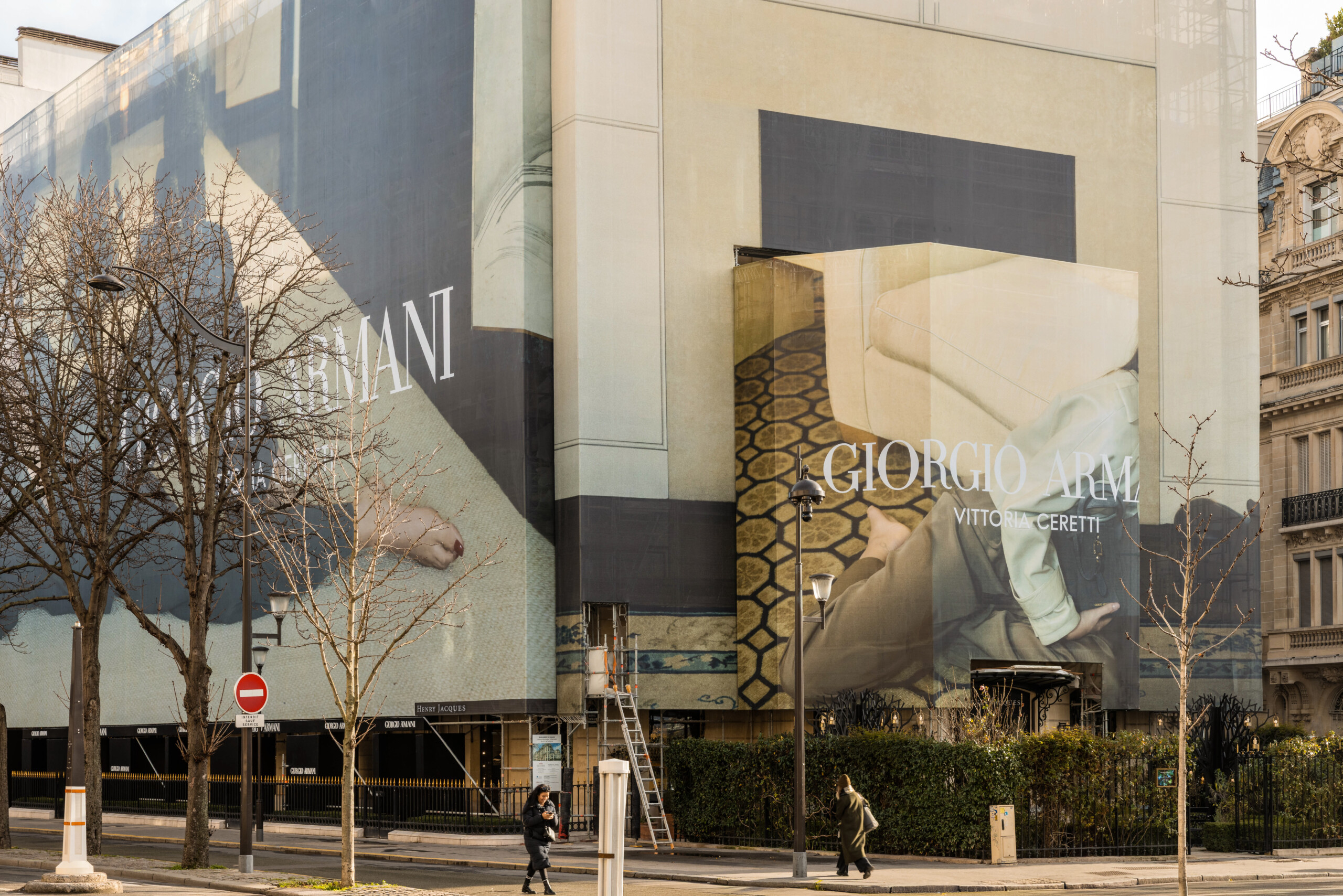 Le choix de Giorgio Armani est un exemple parfait de ce modèle vertueux. En affichant sa campagne Printemps-Été 2026 « Chez Giorgio » en février, au moment précis où l’Italie est au centre du monde, la marque utilise le chantier comme un média utile en temps réel. La toile devient le miroir de l’actualité. Vittoria Ceretti, qui rendait hommage à Giorgio Armani lors de la cérémonie d’ouverture, illumine ici le Triangle d’Or parisien.