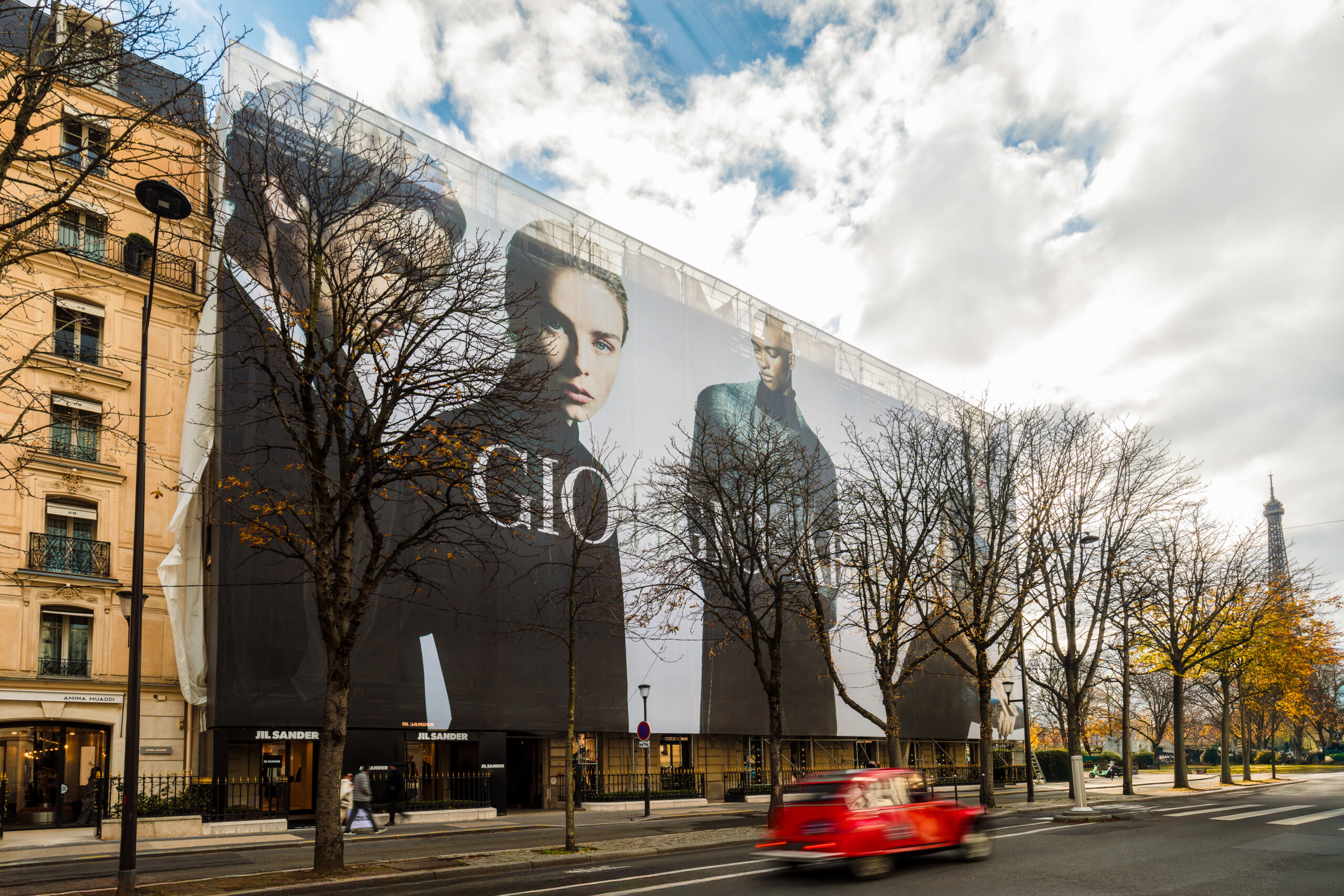 La location d’espace publicitaire sur un lieu prestigieux comme l’Avenue Montaigne, transforme la période de restauration en une opportunité de valeur économique et culturelle pour le site.