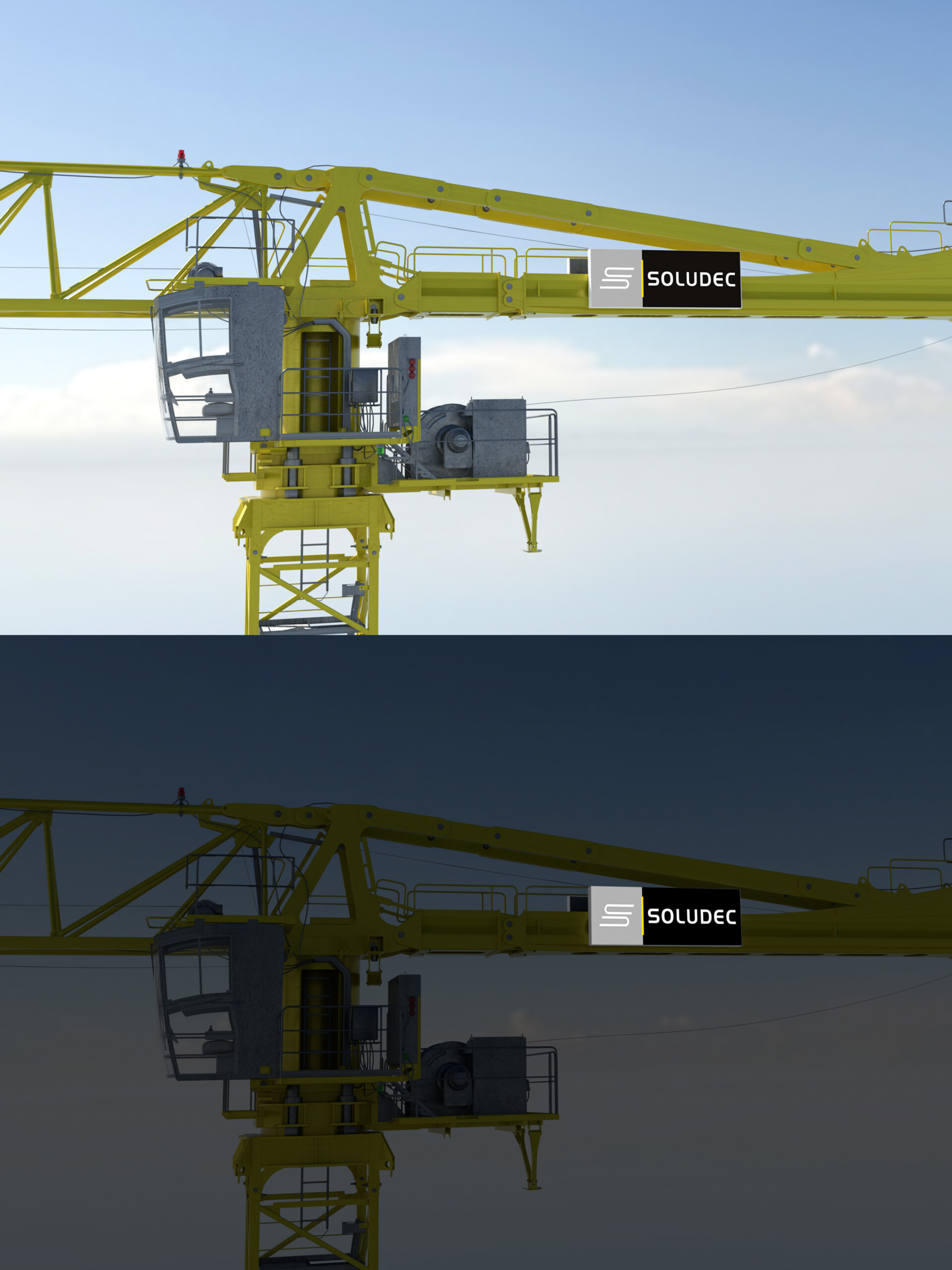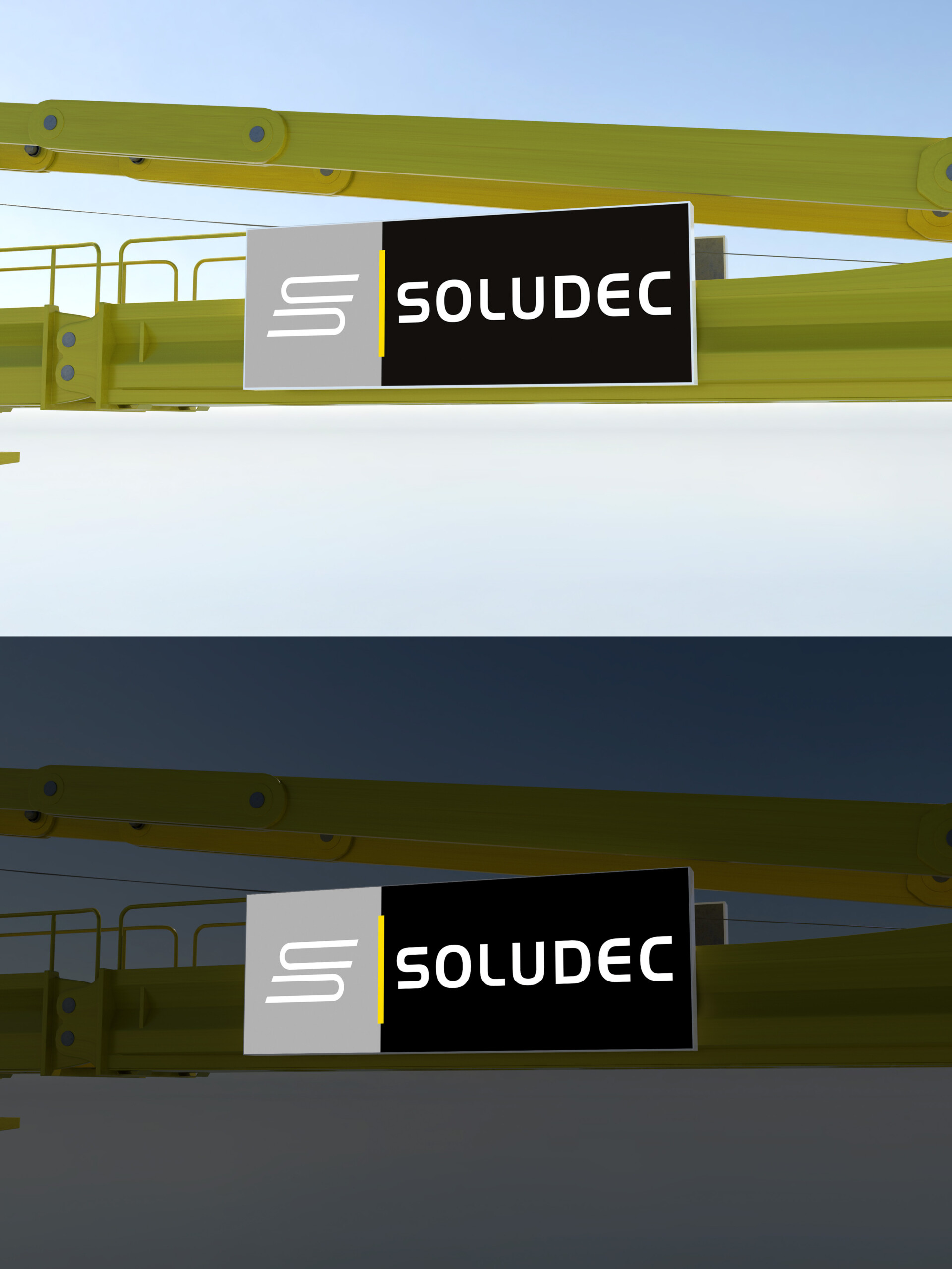 Chaque grue impose ses contraintes. Nous proposons donc la solution au modèle : pour SOLUDEC, des caissons latéraux simple face, fixés sur la contre-flèche. Nos équipes fabriquent l’ensemble : assemblage des châssis, intégration de LED dernière génération, et impression sur notre toile Backlit en vrai recto verso pour un rendu couleur puissant et homogène du logo.