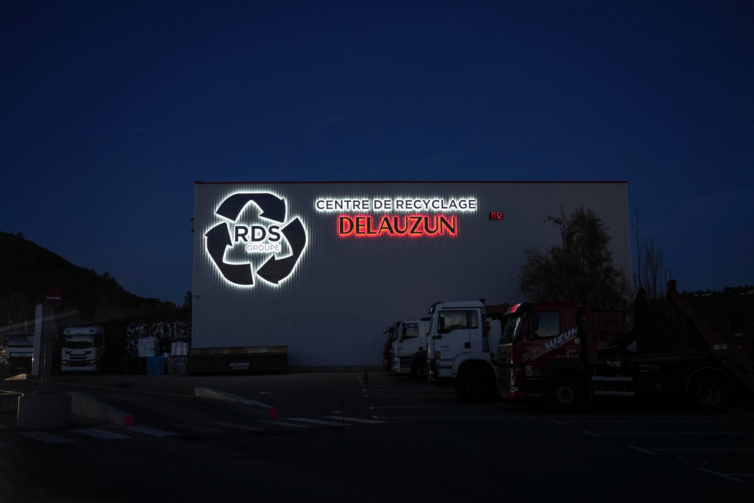 Le centre de recyclage Delauzun, filière du groupe RDS, vient de changer son enseigne sur le site d’Ampuis. Un renouvellement qui s’opère suite à un changement d’identité visuelle. Immanquable au niveau de l’A7, le géant du tri ne voulait pas simplement être remarquable en journée. Son but : attirer les regards depuis l’autoroute du Soleil grâce à une toute nouvelle enseigne traditionnelle lumineuse réalisée dans nos atelier grenoblois.
