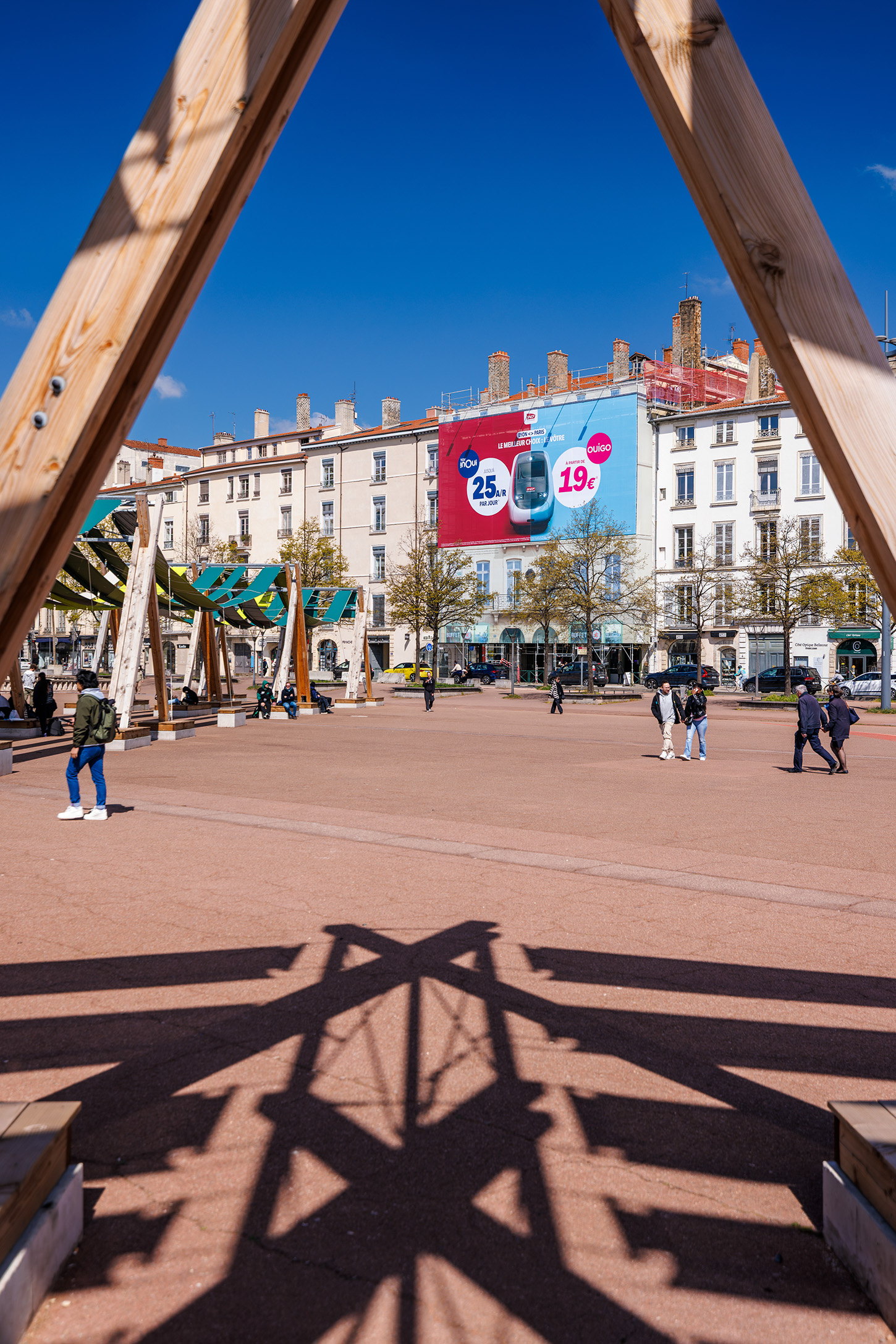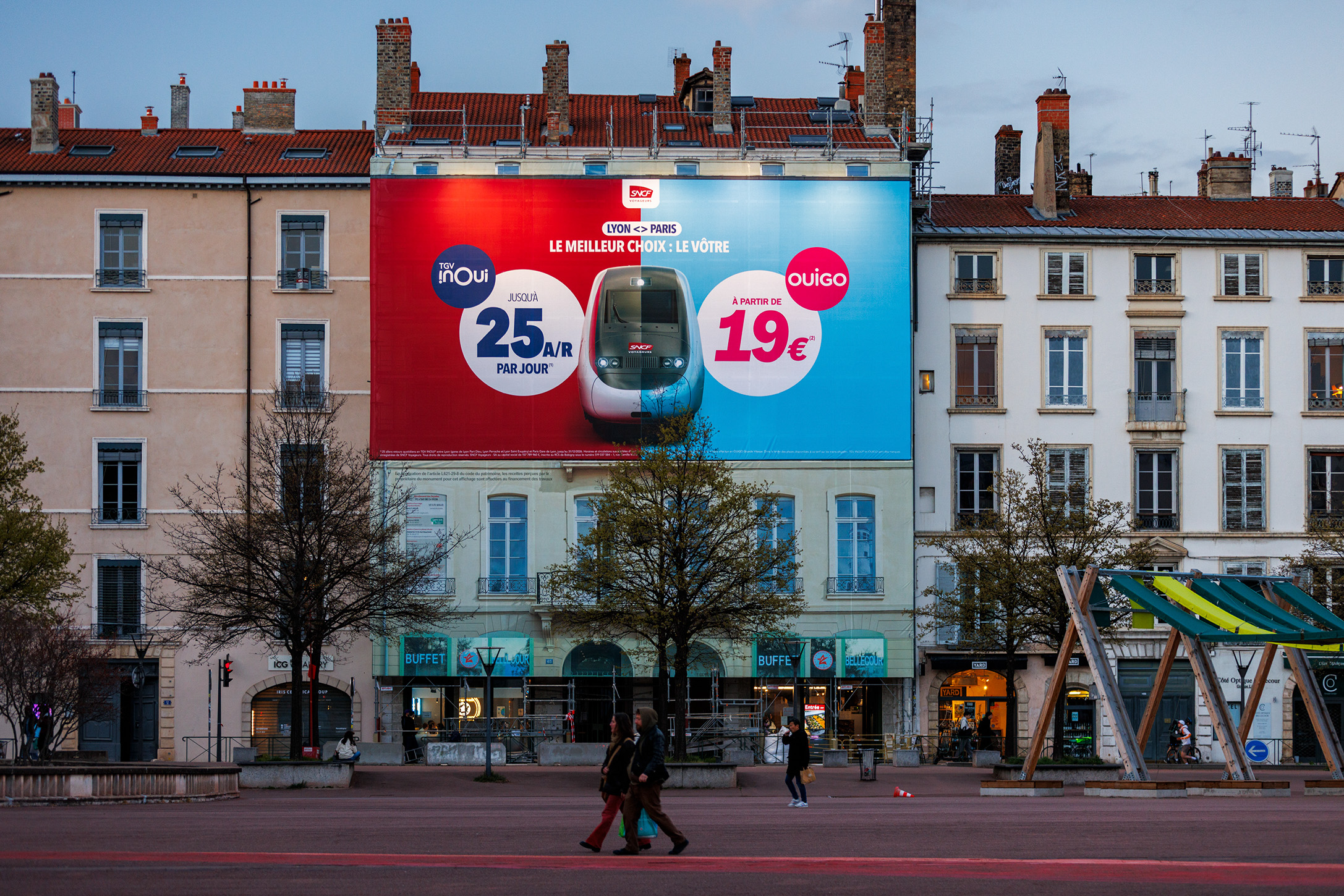 En ce mois d’avril, la SNCF choisit la plus belle place lyonnaise pour promouvoir la mobilité. L’entreprise met en avant deux façons de voyager vers la capitale. D’un côté, le confort de TGV Inouï attire les habitués. De l’autre, les tarifs d’OUIGO séduisent les voyageurs spontanés. Finalement, cette complémentarité réunit toutes les envies. Déjà présente sur un site remarquable similaire en 2022, la marque renouvelle sa présence sur la Presqu’île. Elle y affiche une ambition exceptionnelle avec une toile à la hauteur.