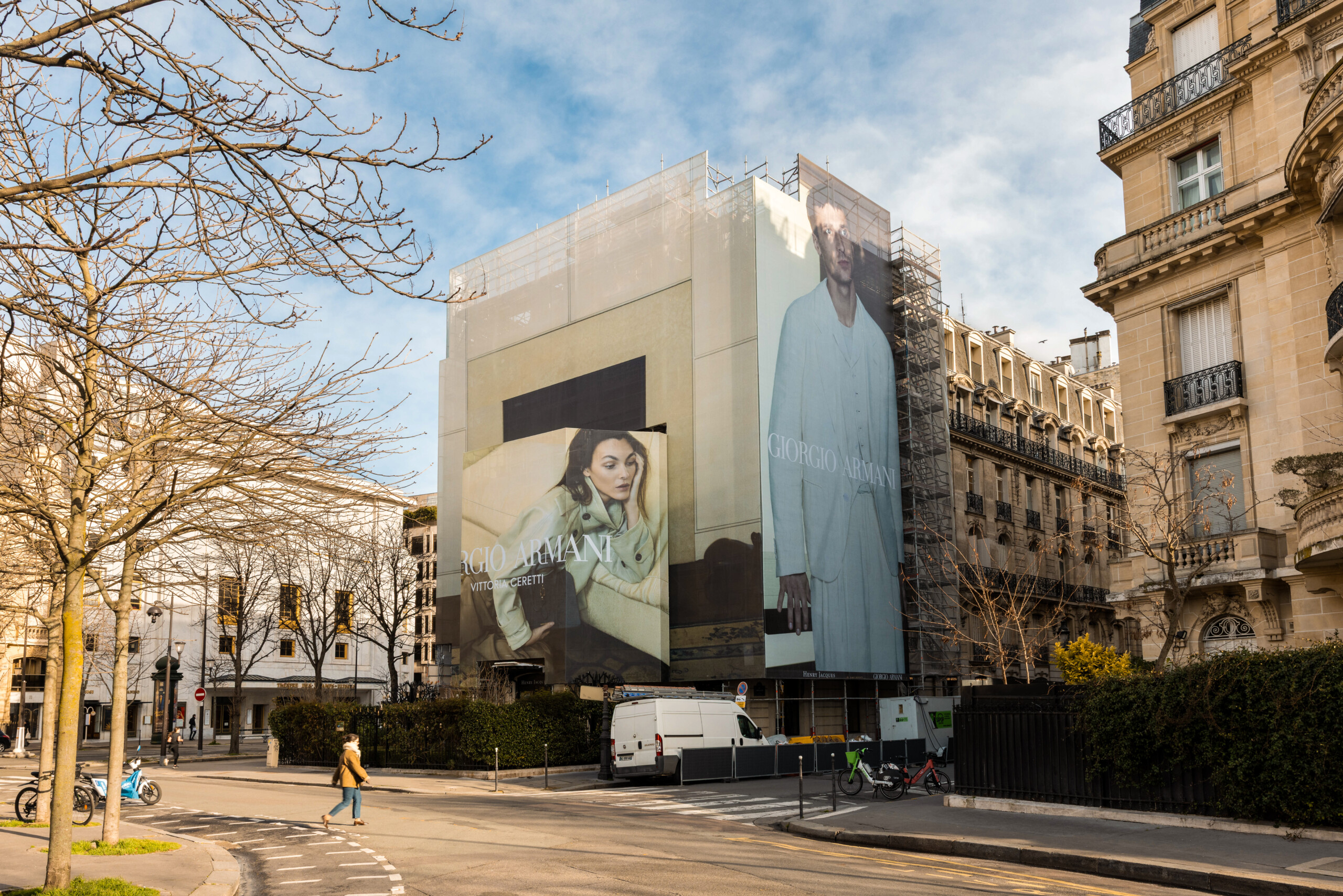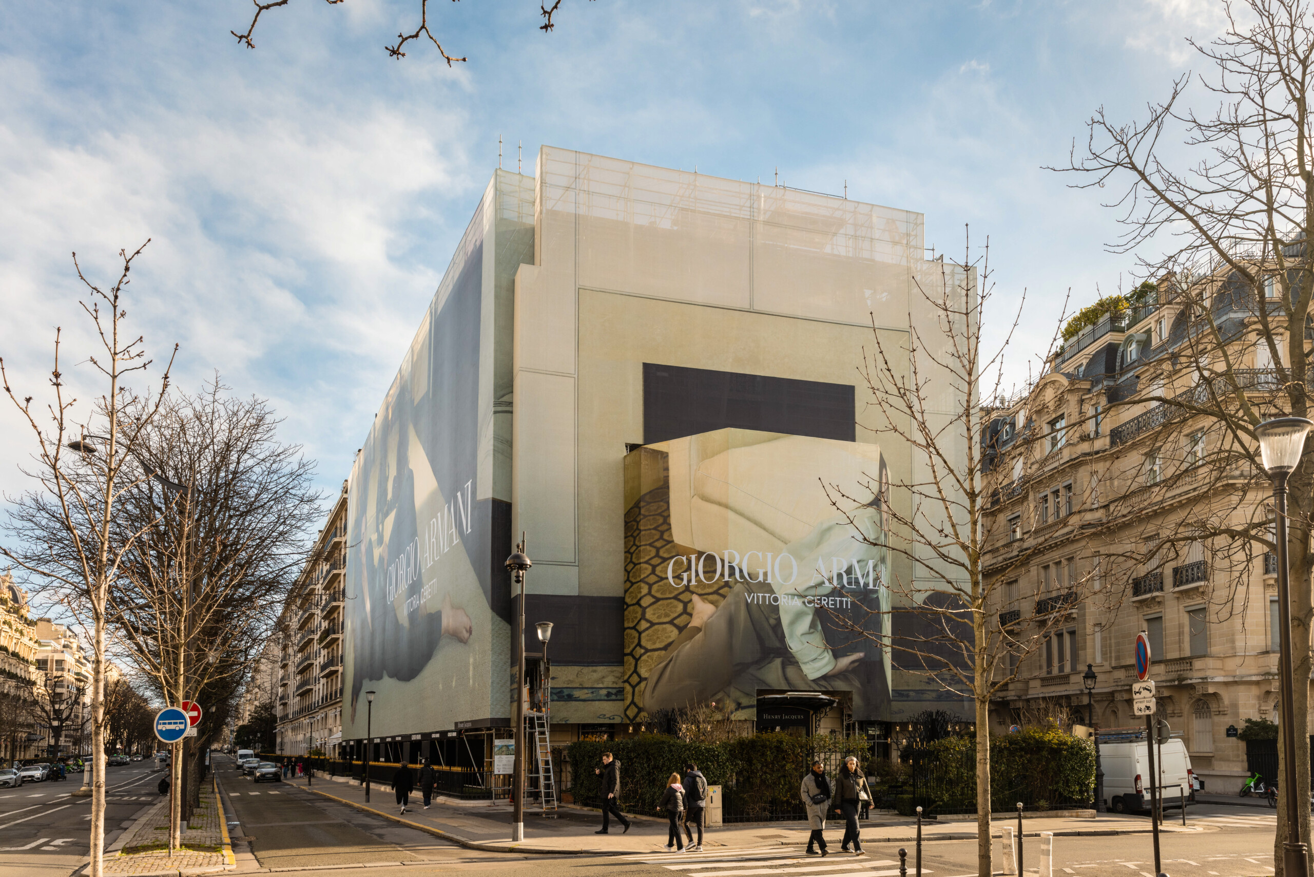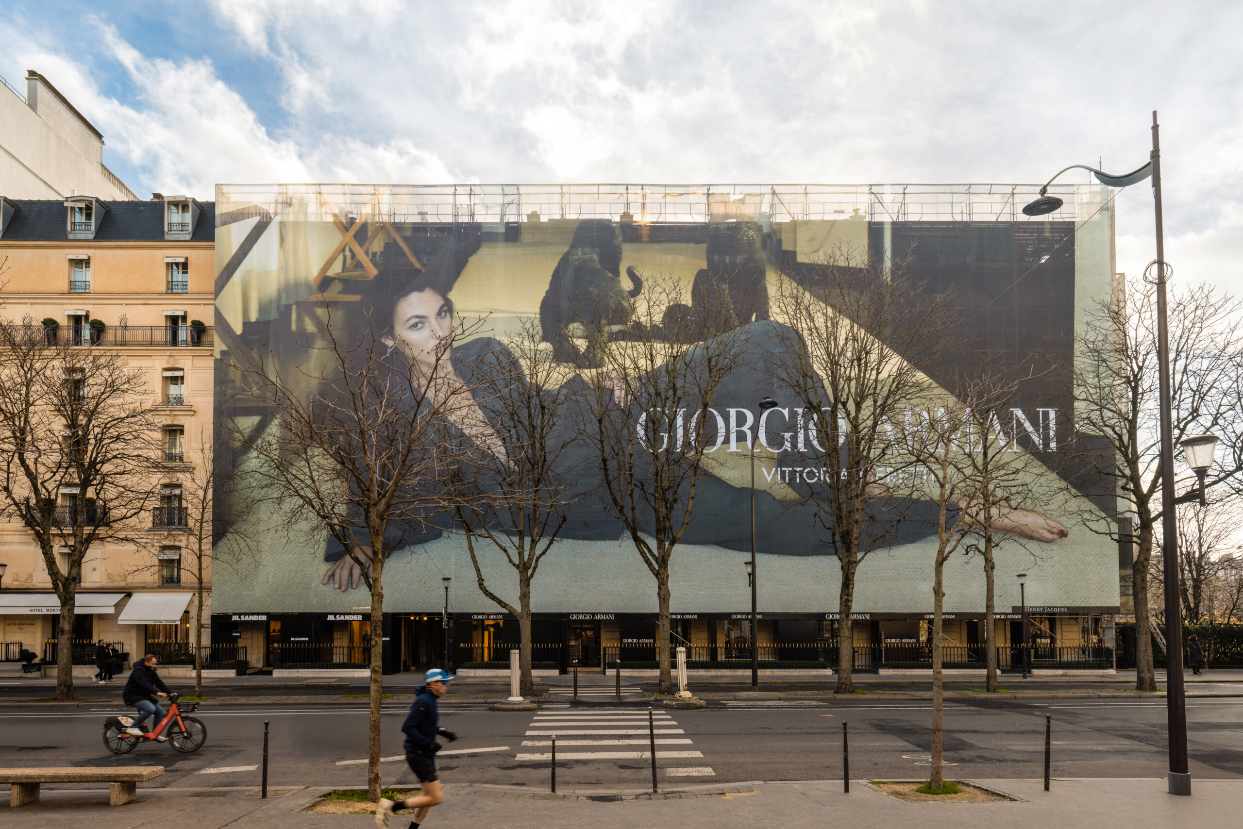 Le choix de Giorgio Armani est un exemple parfait de ce modèle vertueux. En affichant sa campagne Printemps-Été 2026 « Chez Giorgio » en février, au moment précis où l’Italie est au centre du monde, la marque utilise le chantier comme un média utile en temps réel. La toile devient le miroir de l’actualité. Vittoria Ceretti, qui rendait hommage à Giorgio Armani lors de la cérémonie d’ouverture, illumine ici le Triangle d’Or parisien.