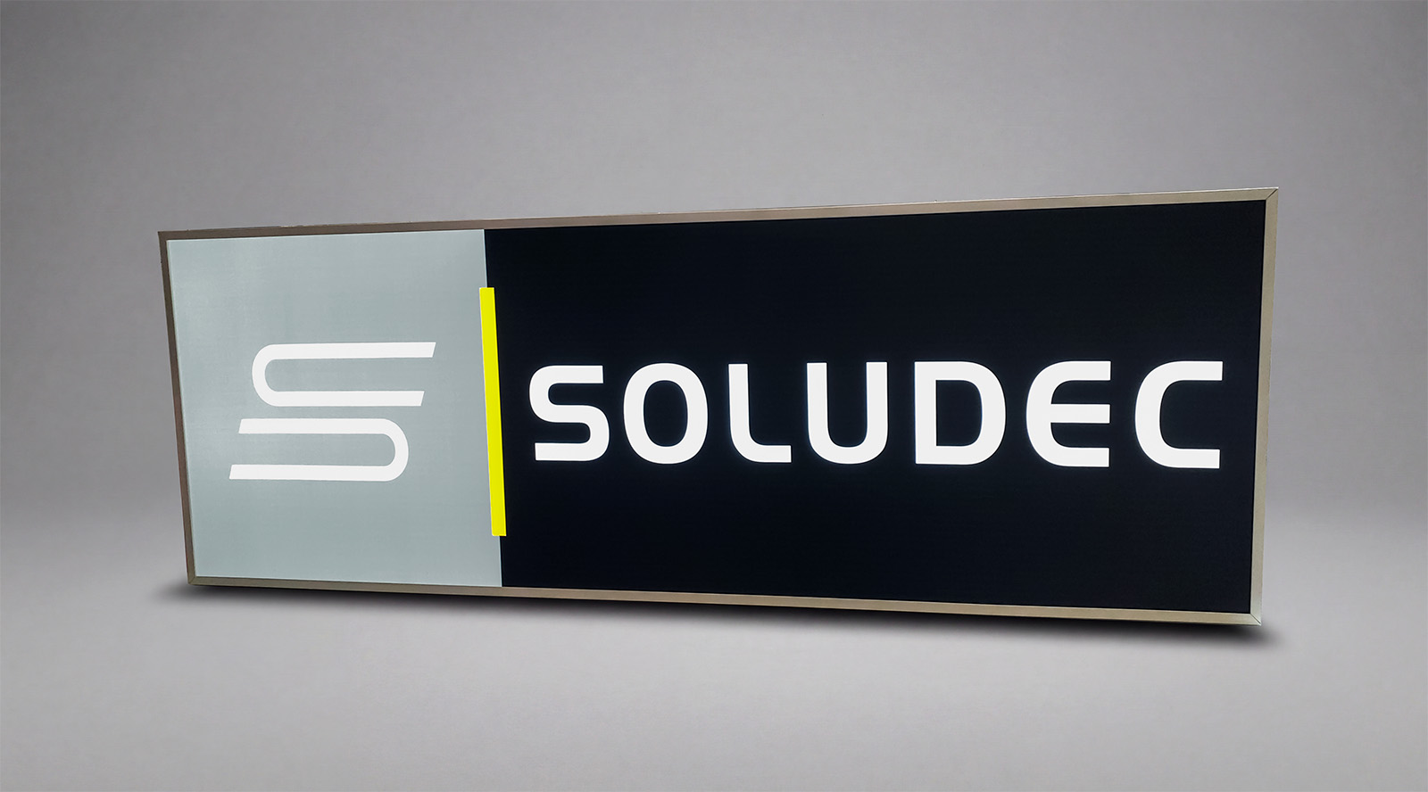 Chaque grue impose ses contraintes. Nous proposons donc la solution au modèle : pour SOLUDEC, des caissons latéraux simple face, fixés sur la contre-flèche. Nos équipes fabriquent l’ensemble : assemblage des châssis, intégration de LED dernière génération, et impression sur notre toile Backlit en vrai recto verso pour un rendu couleur puissant et homogène du logo.